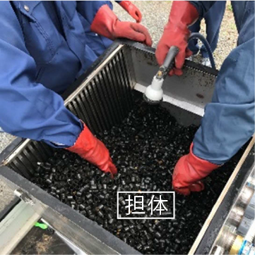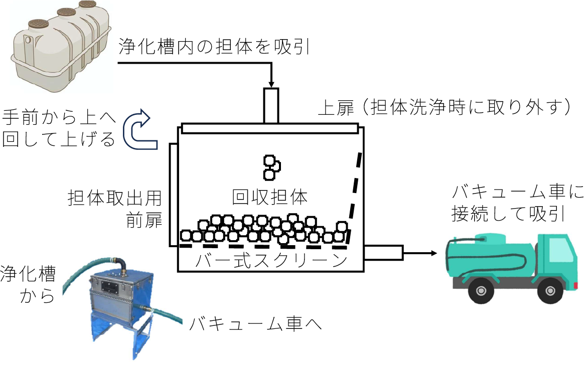 浄化槽の汚泥の中に散らばった担体を、バキューム車の真空を利用して効率的に浄化槽から分離し回収できます。
